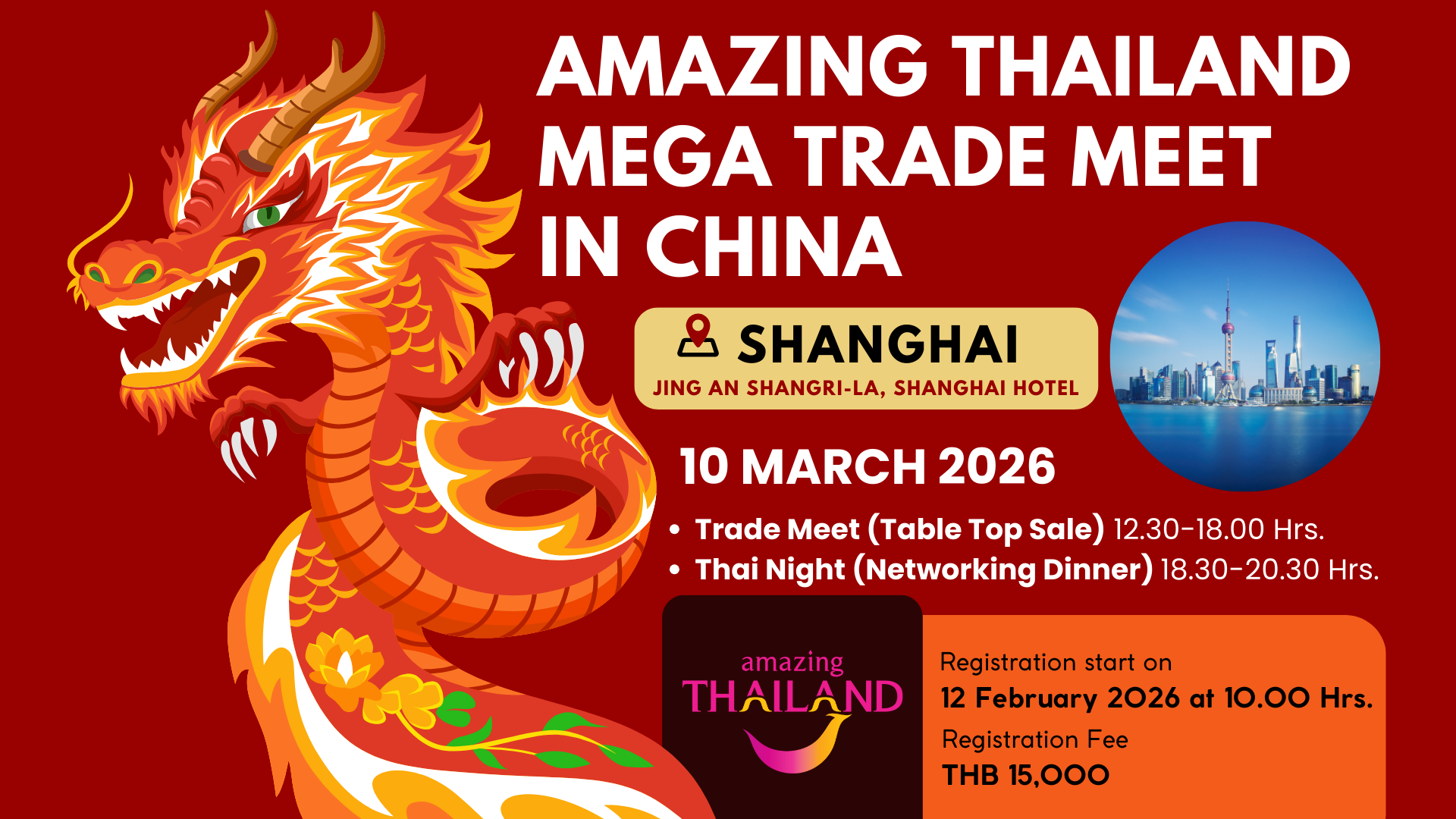 10 March 2026: Shanghai, China Venue: Jing An Shangri-La, Shanghai Hotel Trade Meet (Table Top Sale): 12.30-18.00 Hrs. Thai Night (Networking Dinner): 18.30-20.30 Hrs.